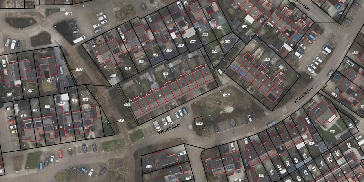 Het perceel waarop Wortelakker 13 staat heeft een oppervlakte van 1230 m². Dit is een zeer groot perceel. De perceeloppervlakte wordt geregistreerd door het Kadaster. Gedetailleerde informatie over de maten van dit perceel kunt u vinden in het rapport Kadastrale kaart met maatvoering van Wortelakker 13.
