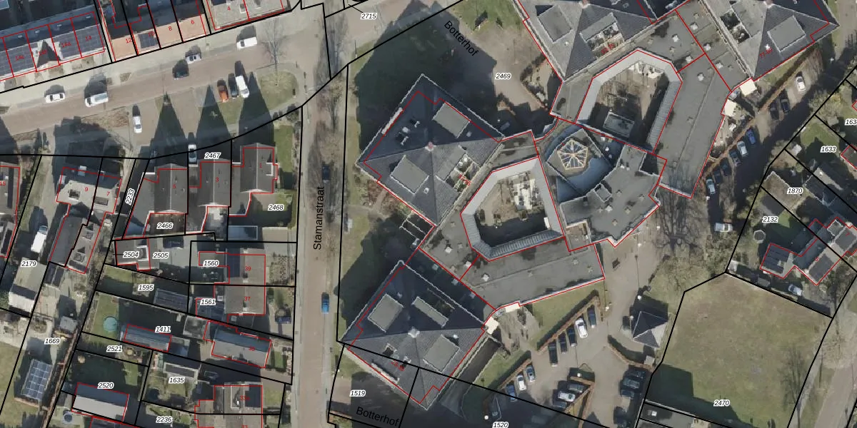 Het perceel waarop Botterhof 37 staat heeft een oppervlakte van 1,0 ha. Dit is een zeer groot perceel. De perceeloppervlakte wordt geregistreerd door het Kadaster. Gedetailleerde informatie over de maten van dit perceel kunt u vinden in het rapport Kadastrale kaart met maatvoering van Botterhof 37.