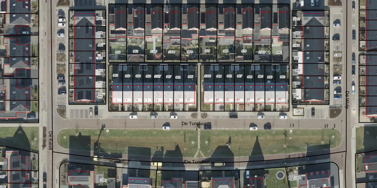 Het perceel waarop De Tureluur 15 staat heeft een oppervlakte van 173 m². Dit is een middelgroot perceel. De perceeloppervlakte wordt geregistreerd door het Kadaster. Gedetailleerde informatie over de maten van dit perceel kunt u vinden in het rapport Kadastrale kaart met maatvoering van De Tureluur 15.