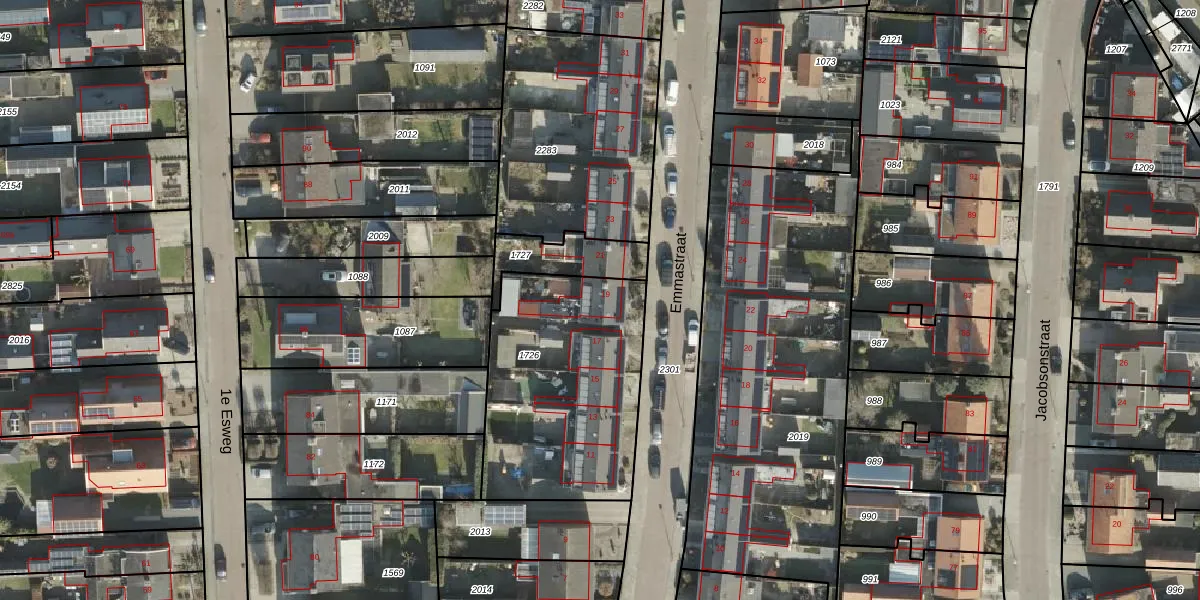 Het perceel waarop Emmastraat 19 staat heeft een oppervlakte van 954 m². Dit is een groot perceel. De perceeloppervlakte wordt geregistreerd door het Kadaster. Gedetailleerde informatie over de maten van dit perceel kunt u vinden in het rapport Kadastrale kaart met maatvoering van Emmastraat 19.