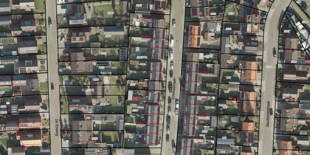 Het perceel waarop Emmastraat 23 staat heeft een oppervlakte van 874 m². Dit is een groot perceel. De perceeloppervlakte wordt geregistreerd door het Kadaster. Gedetailleerde informatie over de maten van dit perceel kunt u vinden in het rapport Kadastrale kaart met maatvoering van Emmastraat 23.