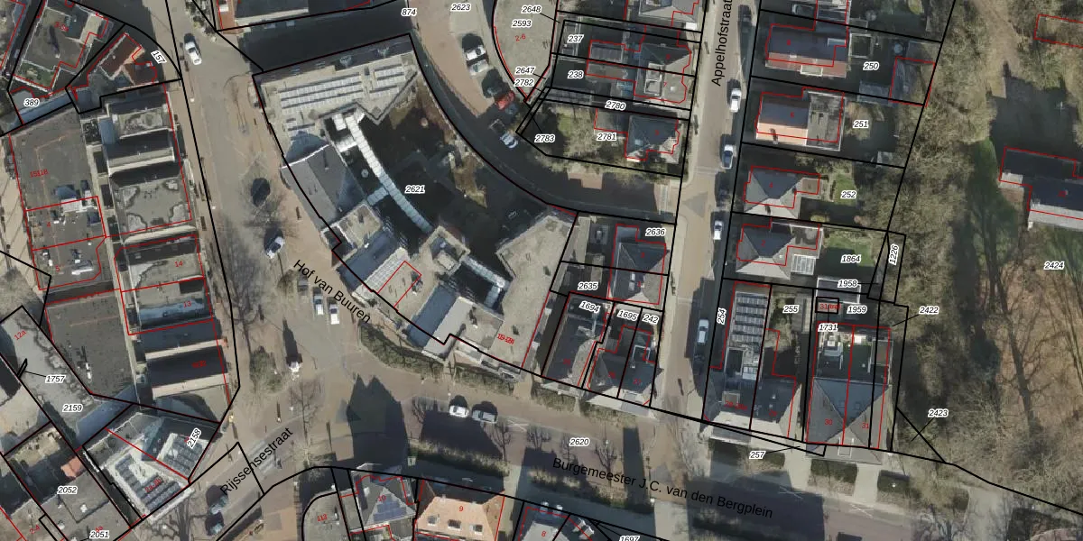 Het perceel waarop Hof van Buuren 8 staat heeft een oppervlakte van 1969 m². Dit is een zeer groot perceel. De perceeloppervlakte wordt geregistreerd door het Kadaster. Gedetailleerde informatie over de maten van dit perceel kunt u vinden in het rapport Kadastrale kaart met maatvoering van Hof van Buuren 8.