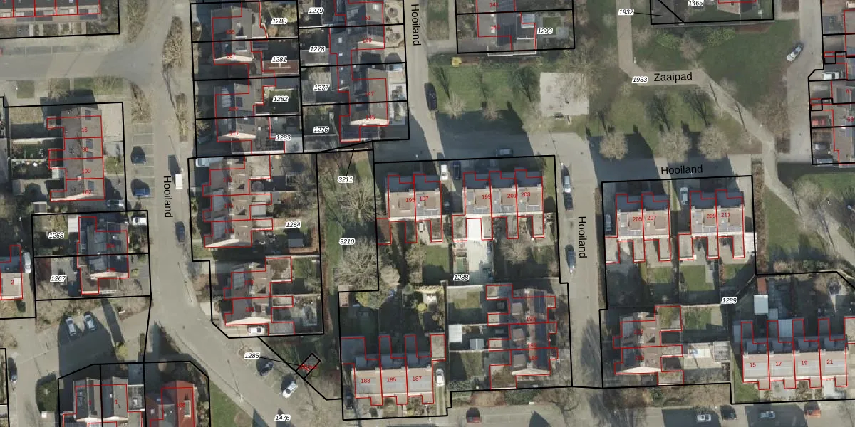 Het perceel waarop Hooiland 197 staat heeft een oppervlakte van 2718 m². Dit is een zeer groot perceel. De perceeloppervlakte wordt geregistreerd door het Kadaster. Gedetailleerde informatie over de maten van dit perceel kunt u vinden in het rapport Kadastrale kaart met maatvoering van Hooiland 197.