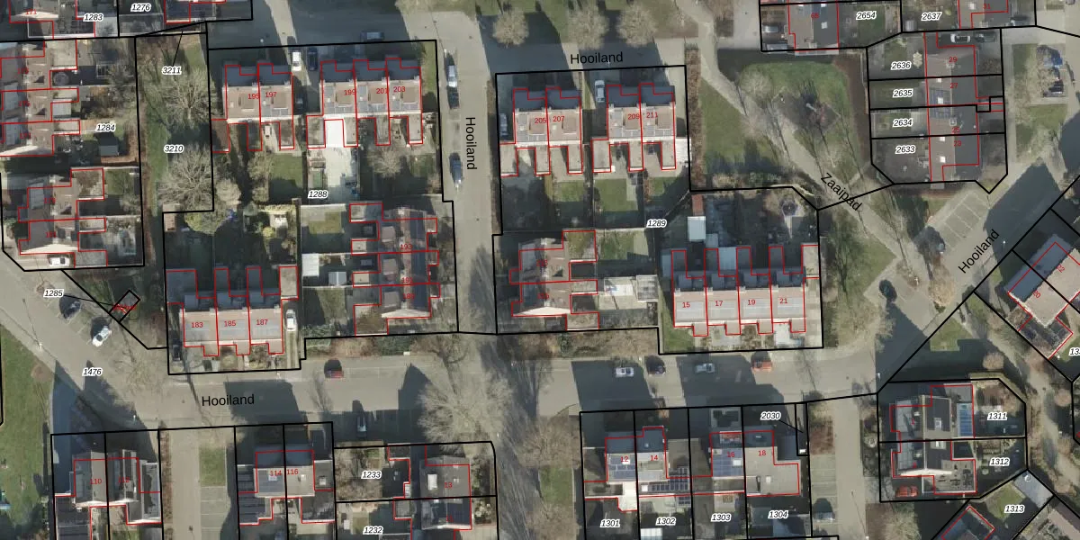 Het perceel waarop Hooiland 213 staat heeft een oppervlakte van 2453 m². Dit is een zeer groot perceel. De perceeloppervlakte wordt geregistreerd door het Kadaster. Gedetailleerde informatie over de maten van dit perceel kunt u vinden in het rapport Kadastrale kaart met maatvoering van Hooiland 213.
