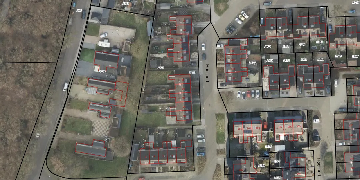 Het perceel waarop Hooiland 90 staat heeft een oppervlakte van 3779 m². Dit is een zeer groot perceel. De perceeloppervlakte wordt geregistreerd door het Kadaster. Gedetailleerde informatie over de maten van dit perceel kunt u vinden in het rapport Kadastrale kaart met maatvoering van Hooiland 90.
