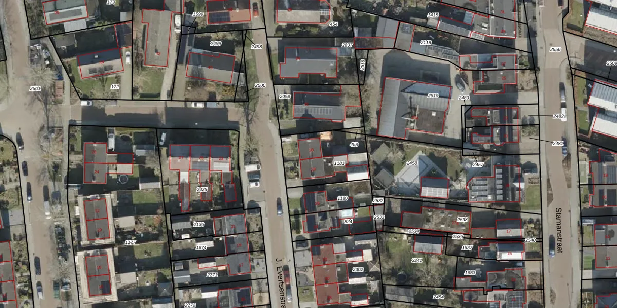 Het perceel waarop J. Evertsenstraat 30 staat heeft een oppervlakte van 454 m². Dit is een groot perceel. De perceeloppervlakte wordt geregistreerd door het Kadaster. Gedetailleerde informatie over de maten van dit perceel kunt u vinden in het rapport Kadastrale kaart met maatvoering van J. Evertsenstraat 30.