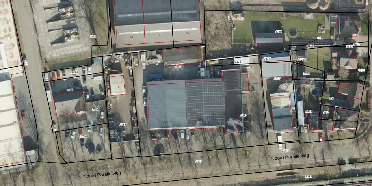 Het perceel waarop Noord Parallelweg 1-a staat heeft een oppervlakte van 3565 m². Dit is een zeer groot perceel. De perceeloppervlakte wordt geregistreerd door het Kadaster. Gedetailleerde informatie over de maten van dit perceel kunt u vinden in het rapport Kadastrale kaart met maatvoering van Noord Parallelweg 1-a.