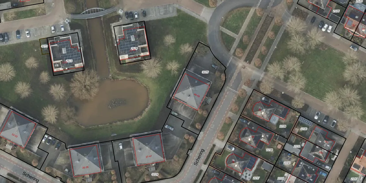 Het perceel waarop Schering 53 staat heeft een oppervlakte van 895 m². Dit is een groot perceel. De perceeloppervlakte wordt geregistreerd door het Kadaster. Gedetailleerde informatie over de maten van dit perceel kunt u vinden in het rapport Kadastrale kaart met maatvoering van Schering 53.