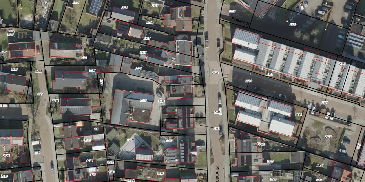 Het perceel waarop Stamanstraat 25 staat heeft een oppervlakte van 1208 m². Dit is een zeer groot perceel. De perceeloppervlakte wordt geregistreerd door het Kadaster. Gedetailleerde informatie over de maten van dit perceel kunt u vinden in het rapport Kadastrale kaart met maatvoering van Stamanstraat 25.