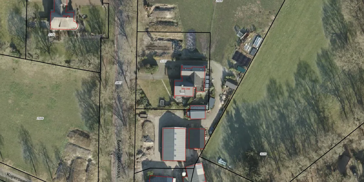Het perceel waarop Vriezenveenseweg 34-a staat heeft een oppervlakte van 1715 m². Dit is een zeer groot perceel. De perceeloppervlakte wordt geregistreerd door het Kadaster. Gedetailleerde informatie over de maten van dit perceel kunt u vinden in het rapport Kadastrale kaart met maatvoering van Vriezenveenseweg 34-a.