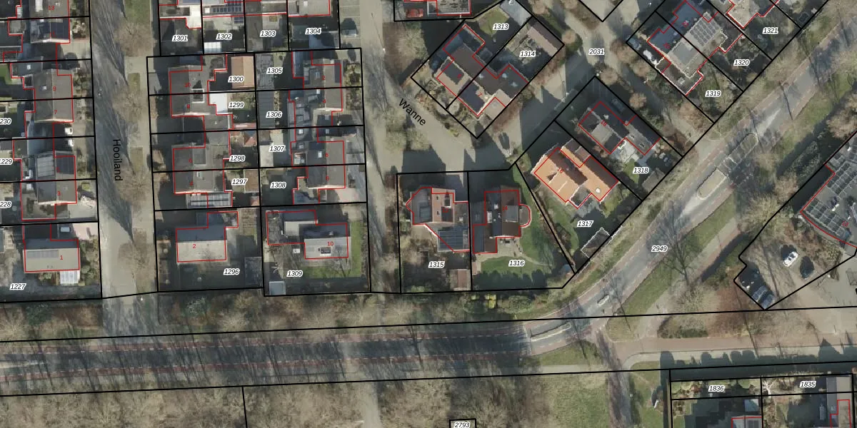 Het perceel waarop Wanne 12 staat heeft een oppervlakte van 464 m². Dit is een groot perceel. De perceeloppervlakte wordt geregistreerd door het Kadaster. Gedetailleerde informatie over de maten van dit perceel kunt u vinden in het rapport Kadastrale kaart met maatvoering van Wanne 12.