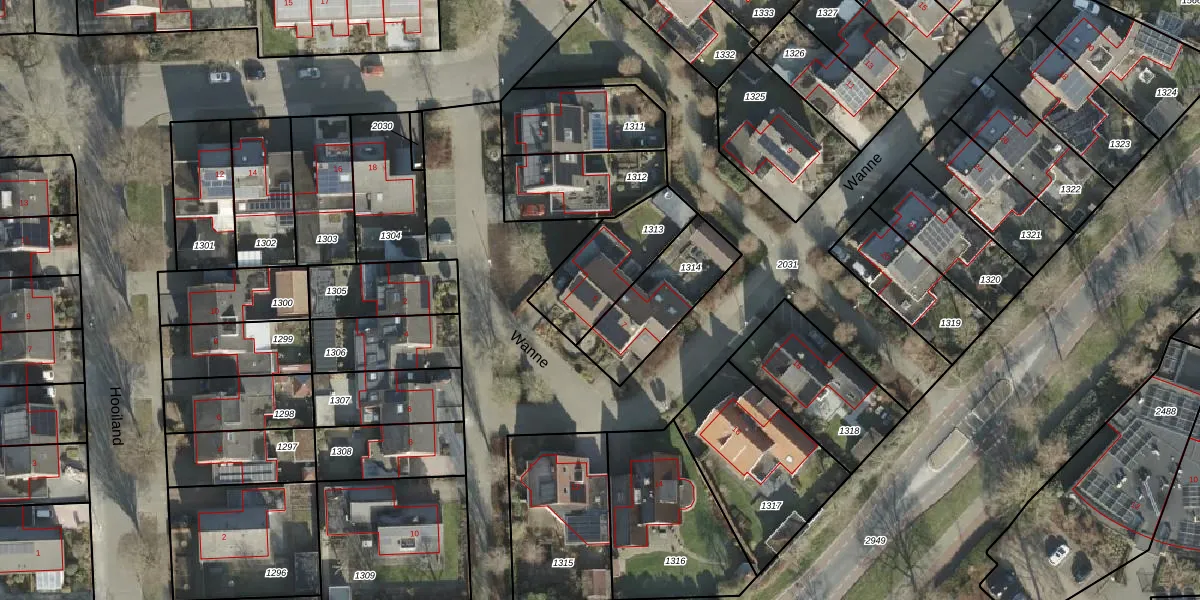 Het perceel waarop Wanne 5 staat heeft een oppervlakte van 303 m². Dit is een groot perceel. De perceeloppervlakte wordt geregistreerd door het Kadaster. Gedetailleerde informatie over de maten van dit perceel kunt u vinden in het rapport Kadastrale kaart met maatvoering van Wanne 5.