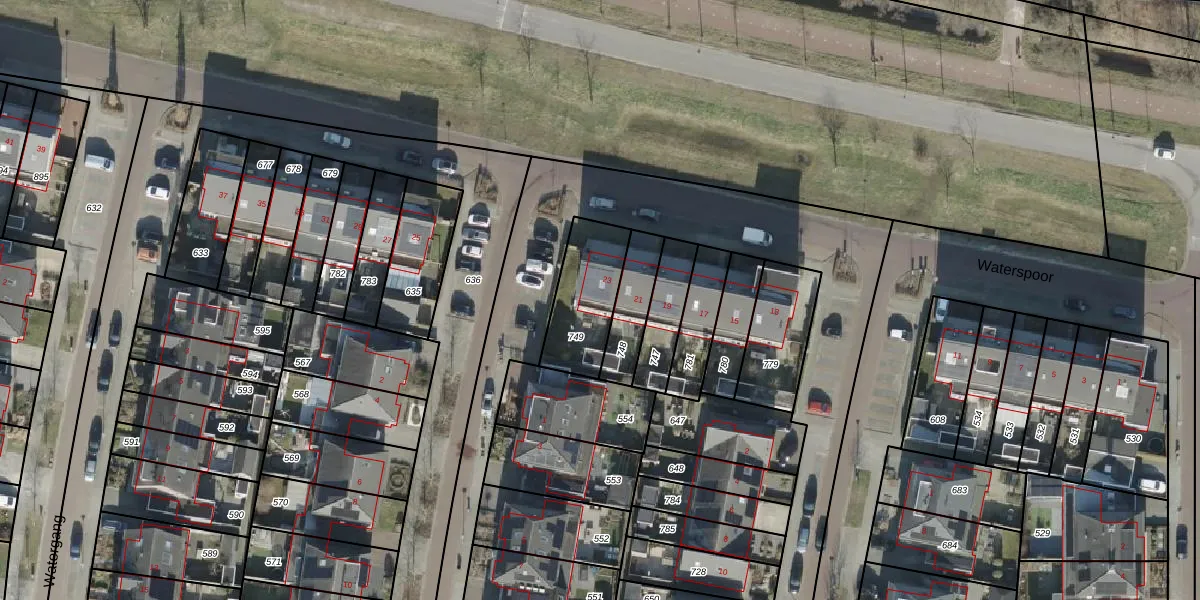 Het perceel waarop Waterspoor 23 staat heeft een oppervlakte van 255 m². Dit is een middelgroot perceel. De perceeloppervlakte wordt geregistreerd door het Kadaster. Gedetailleerde informatie over de maten van dit perceel kunt u vinden in het rapport Kadastrale kaart met maatvoering van Waterspoor 23.