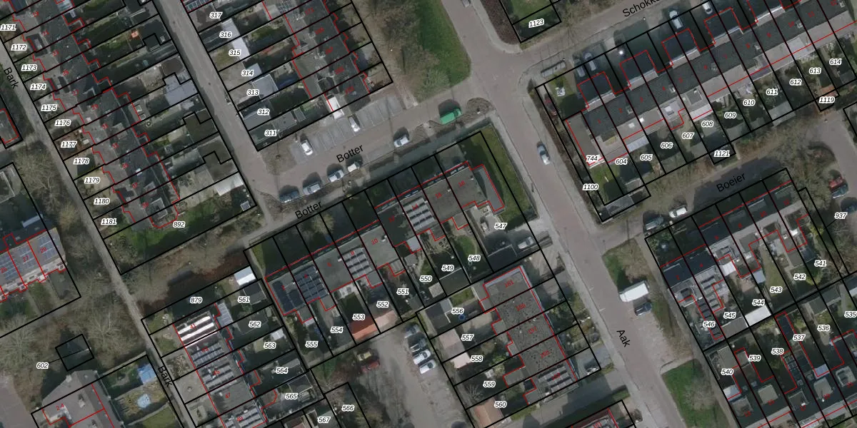 Het perceel waarop Botter 14 staat heeft een oppervlakte van 187 m². Dit is een middelgroot perceel. De perceeloppervlakte wordt geregistreerd door het Kadaster. Gedetailleerde informatie over de maten van dit perceel kunt u vinden in het rapport Kadastrale kaart met maatvoering van Botter 14.