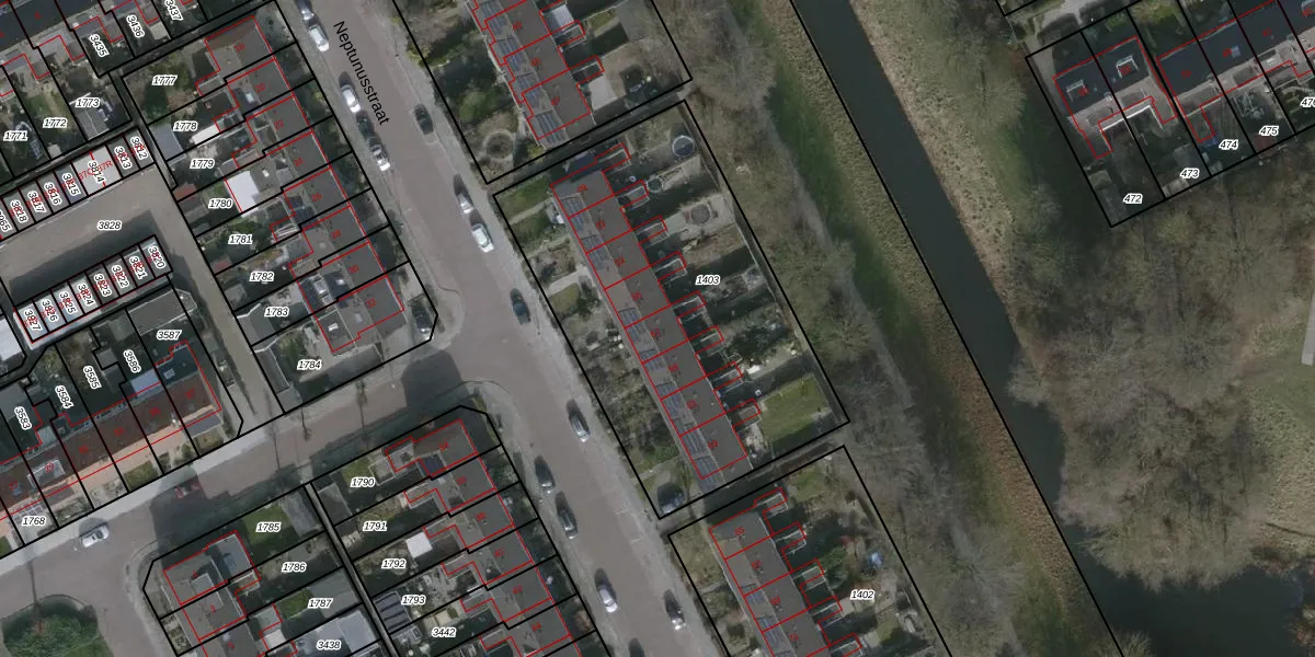 Het perceel waarop Neptunusstraat 57 staat heeft een oppervlakte van 1793 m². Dit is een zeer groot perceel. De perceeloppervlakte wordt geregistreerd door het Kadaster. Gedetailleerde informatie over de maten van dit perceel kunt u vinden in het rapport Kadastrale kaart met maatvoering van Neptunusstraat 57.