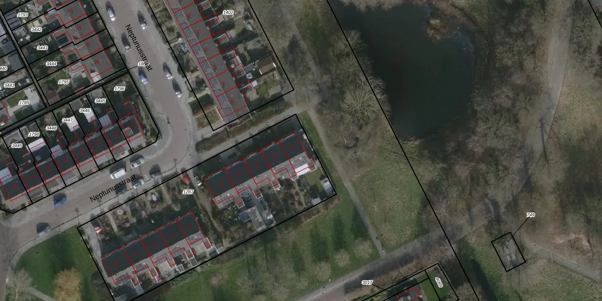 Het perceel waarop Neptunusstraat 81 staat heeft een oppervlakte van 2434 m². Dit is een zeer groot perceel. De perceeloppervlakte wordt geregistreerd door het Kadaster. Gedetailleerde informatie over de maten van dit perceel kunt u vinden in het rapport Kadastrale kaart met maatvoering van Neptunusstraat 81.