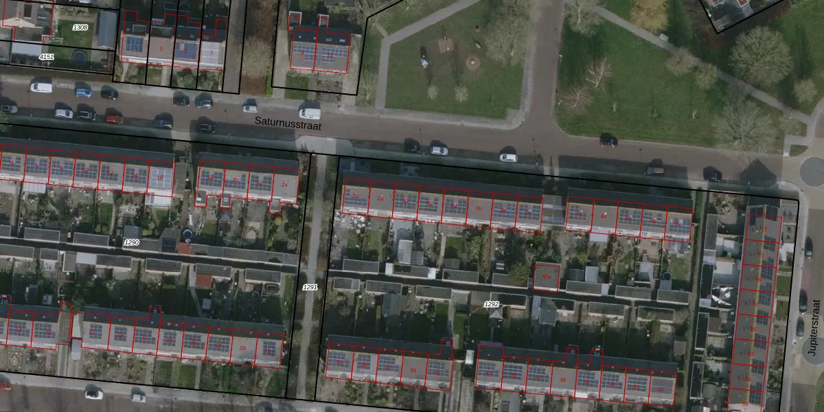 Het perceel waarop Saturnusstraat 30 staat heeft een oppervlakte van 6642 m². Dit is een zeer groot perceel. De perceeloppervlakte wordt geregistreerd door het Kadaster. Gedetailleerde informatie over de maten van dit perceel kunt u vinden in het rapport Kadastrale kaart met maatvoering van Saturnusstraat 30.