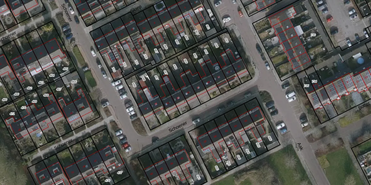 Het perceel waarop Schoener 65 staat heeft een oppervlakte van 177 m². Dit is een middelgroot perceel. De perceeloppervlakte wordt geregistreerd door het Kadaster. Gedetailleerde informatie over de maten van dit perceel kunt u vinden in het rapport Kadastrale kaart met maatvoering van Schoener 65.