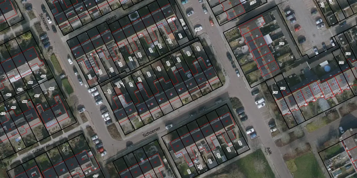 Het perceel waarop Schoener 69 staat heeft een oppervlakte van 177 m². Dit is een middelgroot perceel. De perceeloppervlakte wordt geregistreerd door het Kadaster. Gedetailleerde informatie over de maten van dit perceel kunt u vinden in het rapport Kadastrale kaart met maatvoering van Schoener 69.