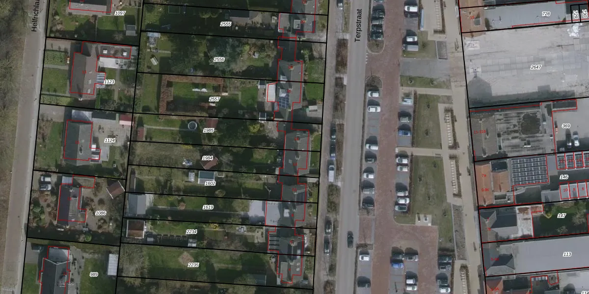 Het perceel waarop Terpstraat 14 staat heeft een oppervlakte van 598 m². Dit is een groot perceel. De perceeloppervlakte wordt geregistreerd door het Kadaster. Gedetailleerde informatie over de maten van dit perceel kunt u vinden in het rapport Kadastrale kaart met maatvoering van Terpstraat 14.