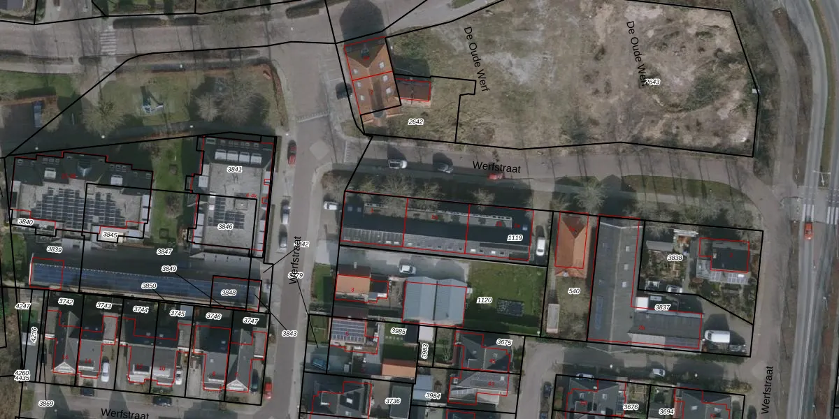 Het perceel waarop Werfstraat 1-b staat heeft een oppervlakte van 650 m². Dit is een groot perceel. De perceeloppervlakte wordt geregistreerd door het Kadaster. Gedetailleerde informatie over de maten van dit perceel kunt u vinden in het rapport Kadastrale kaart met maatvoering van Werfstraat 1-b.