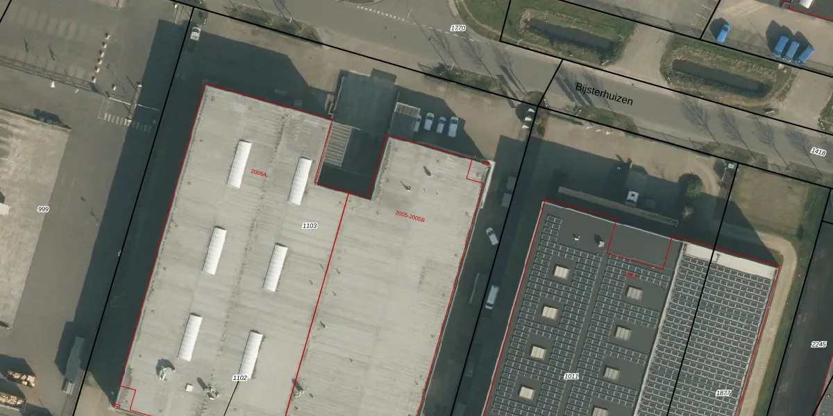 Het perceel waarop Bijsterhuizen 2005-B staat heeft een oppervlakte van 9421 m². Dit is een zeer groot perceel. De perceeloppervlakte wordt geregistreerd door het Kadaster. Gedetailleerde informatie over de maten van dit perceel kunt u vinden in het rapport Kadastrale kaart met maatvoering van Bijsterhuizen 2005-B.