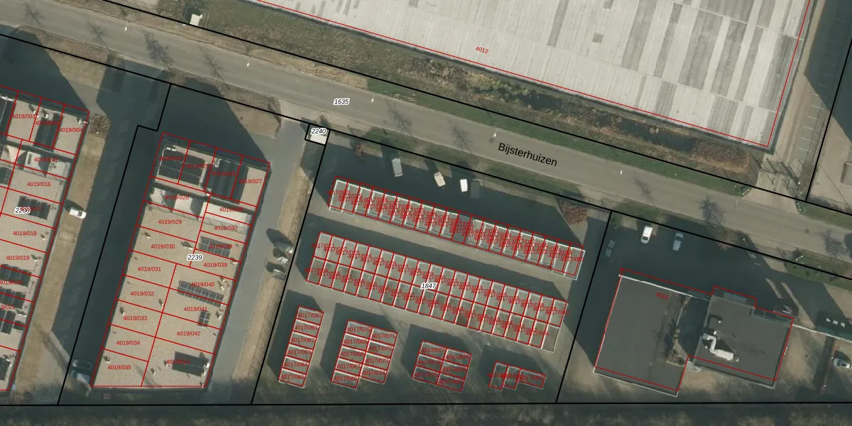 Het perceel waarop Bijsterhuizen 4017-013 staat heeft een oppervlakte van 3900 m². Dit is een zeer groot perceel. De perceeloppervlakte wordt geregistreerd door het Kadaster. Gedetailleerde informatie over de maten van dit perceel kunt u vinden in het rapport Kadastrale kaart met maatvoering van Bijsterhuizen 4017-013.