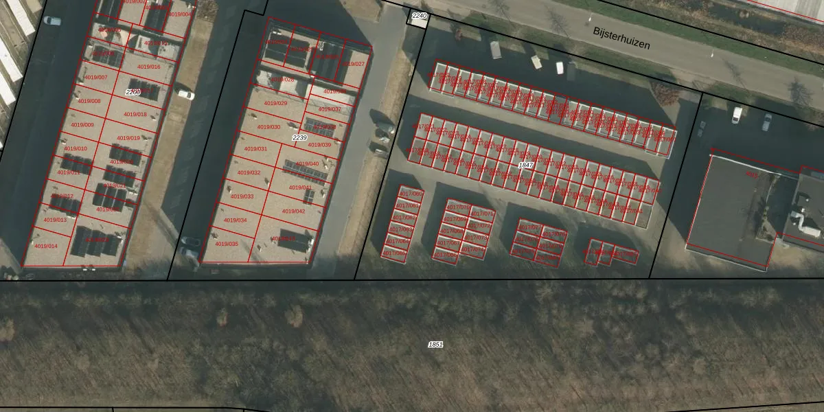 Het perceel waarop Bijsterhuizen 4017-061 staat heeft een oppervlakte van 3900 m². Dit is een zeer groot perceel. De perceeloppervlakte wordt geregistreerd door het Kadaster. Gedetailleerde informatie over de maten van dit perceel kunt u vinden in het rapport Kadastrale kaart met maatvoering van Bijsterhuizen 4017-061.