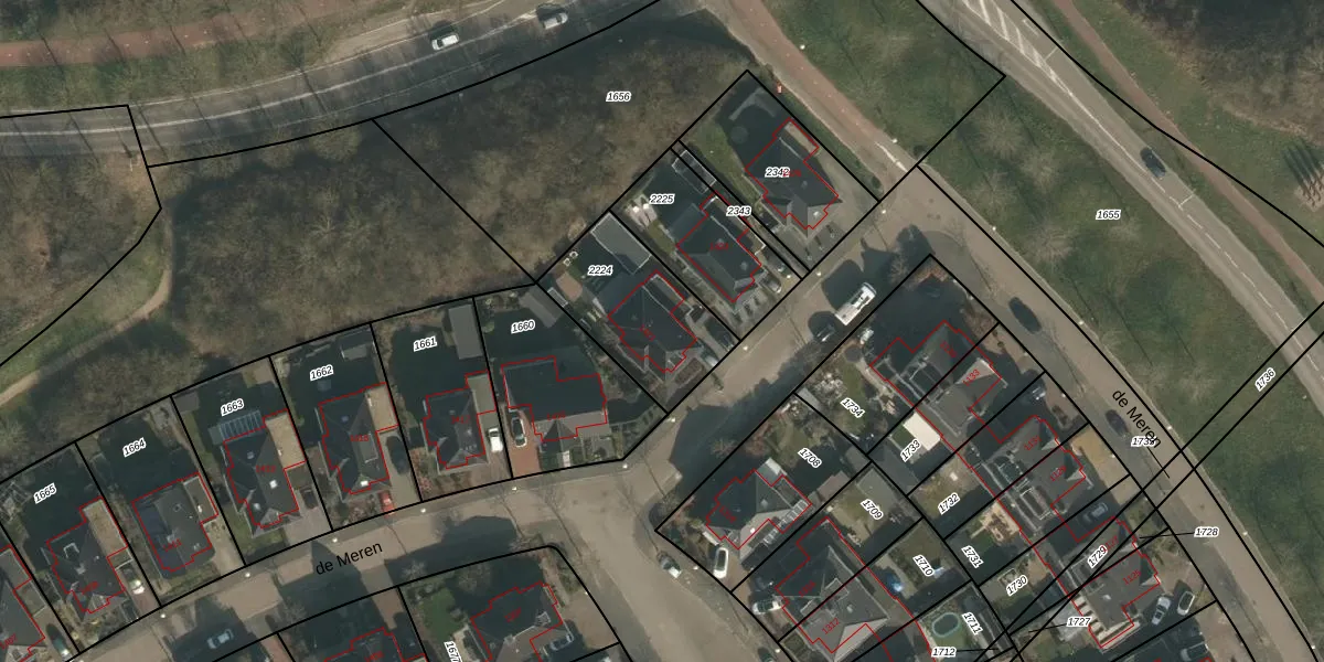 de Meren 1421 is gelegen op kadastraal perceel WCN00P2224. Deze kadastrale aanduiding is uniek en wordt gebruikt door het Kadaster om eigendomsrechten en andere zakelijke rechten vast te leggen. Het perceel maakt onderdeel uit van de kadastrale gemeente Wijchen.