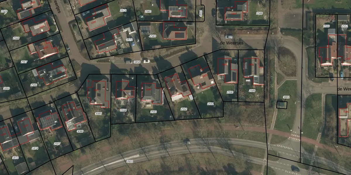de Weertjes 1007 is gelegen op kadastraal perceel WCN00F2592. Deze kadastrale aanduiding is uniek en wordt gebruikt door het Kadaster om eigendomsrechten en andere zakelijke rechten vast te leggen. Het perceel maakt onderdeel uit van de kadastrale gemeente Wijchen.