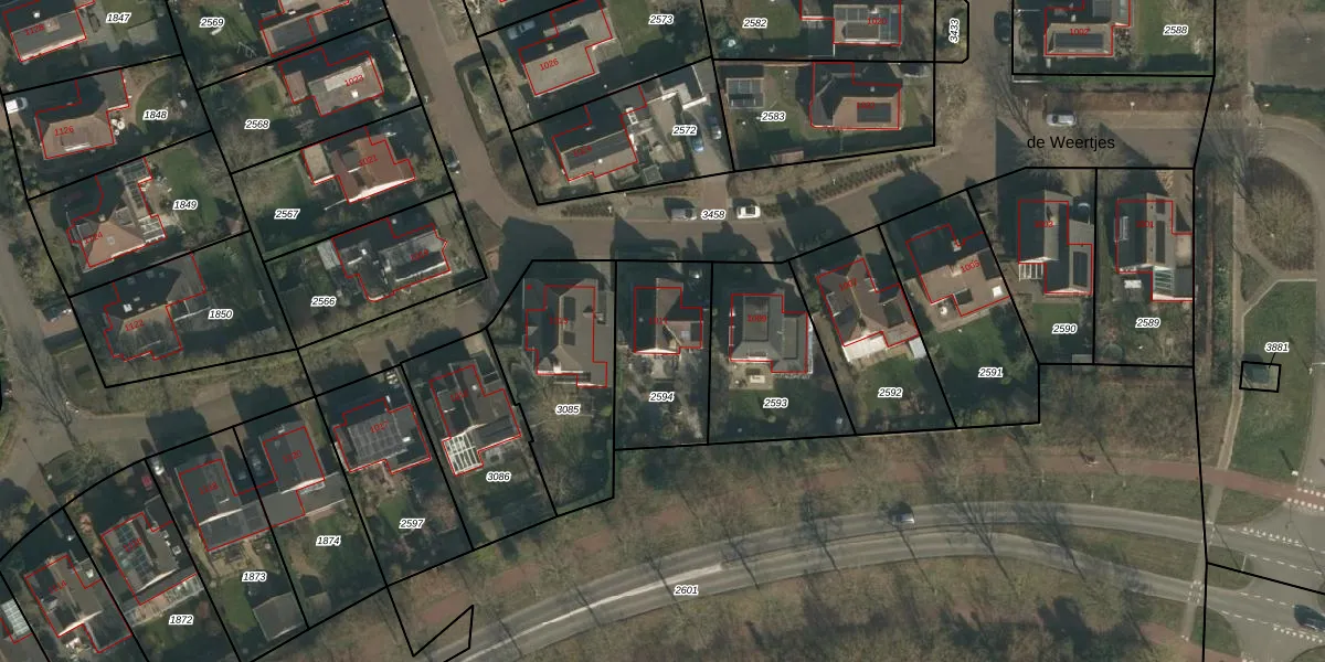 de Weertjes 1011 is gelegen op kadastraal perceel WCN00F2594. Deze kadastrale aanduiding is uniek en wordt gebruikt door het Kadaster om eigendomsrechten en andere zakelijke rechten vast te leggen. Het perceel maakt onderdeel uit van de kadastrale gemeente Wijchen.