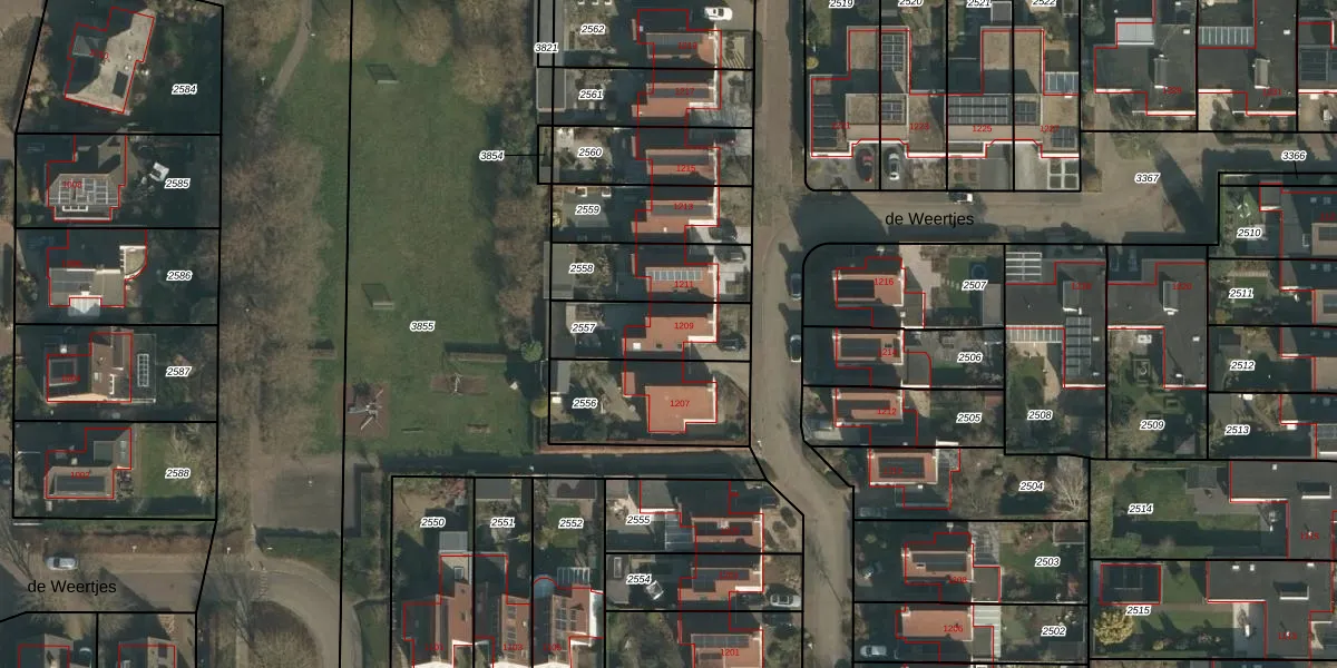 de Weertjes 1209 is gelegen op kadastraal perceel WCN00F2557. Deze kadastrale aanduiding is uniek en wordt gebruikt door het Kadaster om eigendomsrechten en andere zakelijke rechten vast te leggen. Het perceel maakt onderdeel uit van de kadastrale gemeente Wijchen.