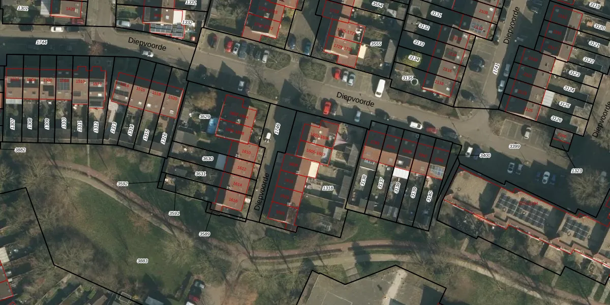 Het perceel waarop Diepvoorde 1605 staat heeft een oppervlakte van 950 m². Dit is een groot perceel. De perceeloppervlakte wordt geregistreerd door het Kadaster. Gedetailleerde informatie over de maten van dit perceel kunt u vinden in het rapport Kadastrale kaart met maatvoering van Diepvoorde 1605.