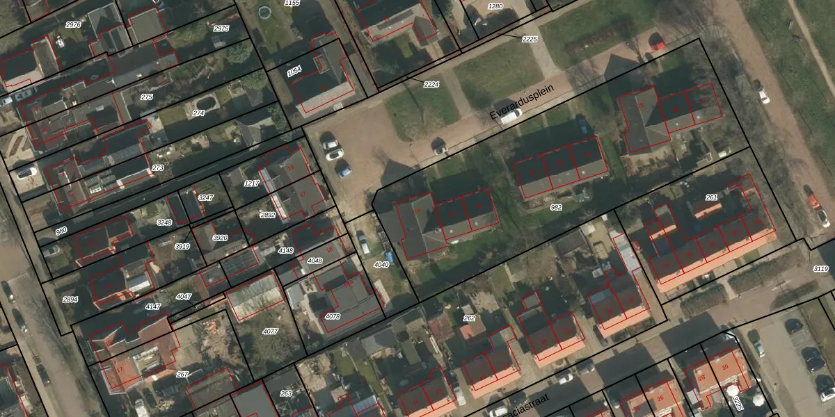 Het perceel waarop Everardusplein 19 staat heeft een oppervlakte van 2475 m². Dit is een zeer groot perceel. De perceeloppervlakte wordt geregistreerd door het Kadaster. Gedetailleerde informatie over de maten van dit perceel kunt u vinden in het rapport Kadastrale kaart met maatvoering van Everardusplein 19.