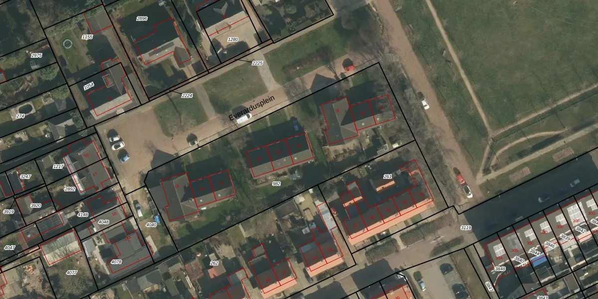 Het perceel waarop Everardusplein 24 staat heeft een oppervlakte van 2475 m². Dit is een zeer groot perceel. De perceeloppervlakte wordt geregistreerd door het Kadaster. Gedetailleerde informatie over de maten van dit perceel kunt u vinden in het rapport Kadastrale kaart met maatvoering van Everardusplein 24.