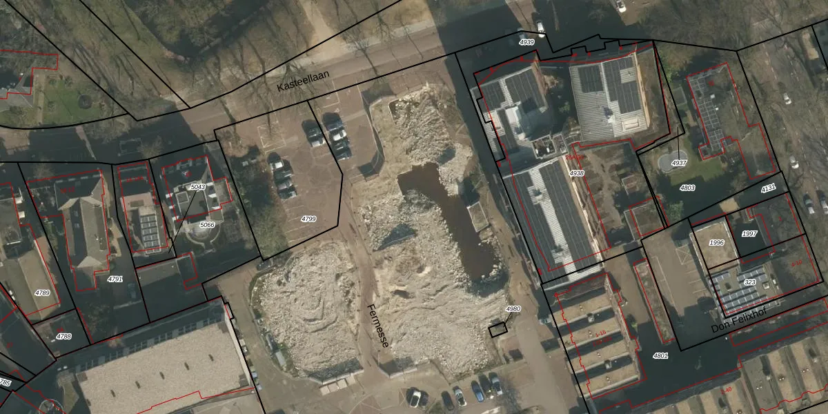 Het perceel waarop Fermesse 19 staat heeft een oppervlakte van 6769 m². Dit is een zeer groot perceel. De perceeloppervlakte wordt geregistreerd door het Kadaster. Gedetailleerde informatie over de maten van dit perceel kunt u vinden in het rapport Kadastrale kaart met maatvoering van Fermesse 19.