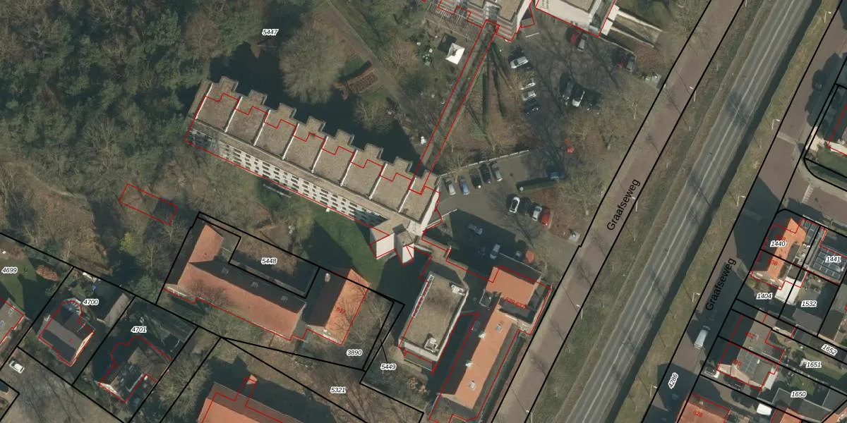 Het perceel waarop Graafseweg 633-A staat heeft een oppervlakte van 2,5 ha. Dit is een zeer groot perceel. De perceeloppervlakte wordt geregistreerd door het Kadaster. Gedetailleerde informatie over de maten van dit perceel kunt u vinden in het rapport Kadastrale kaart met maatvoering van Graafseweg 633-A.