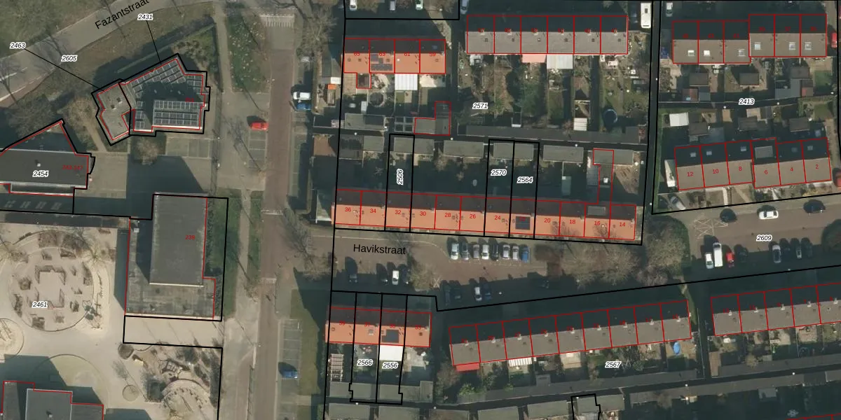 Het perceel waarop Havikstraat 30 staat heeft een oppervlakte van 3611 m². Dit is een zeer groot perceel. De perceeloppervlakte wordt geregistreerd door het Kadaster. Gedetailleerde informatie over de maten van dit perceel kunt u vinden in het rapport Kadastrale kaart met maatvoering van Havikstraat 30.
