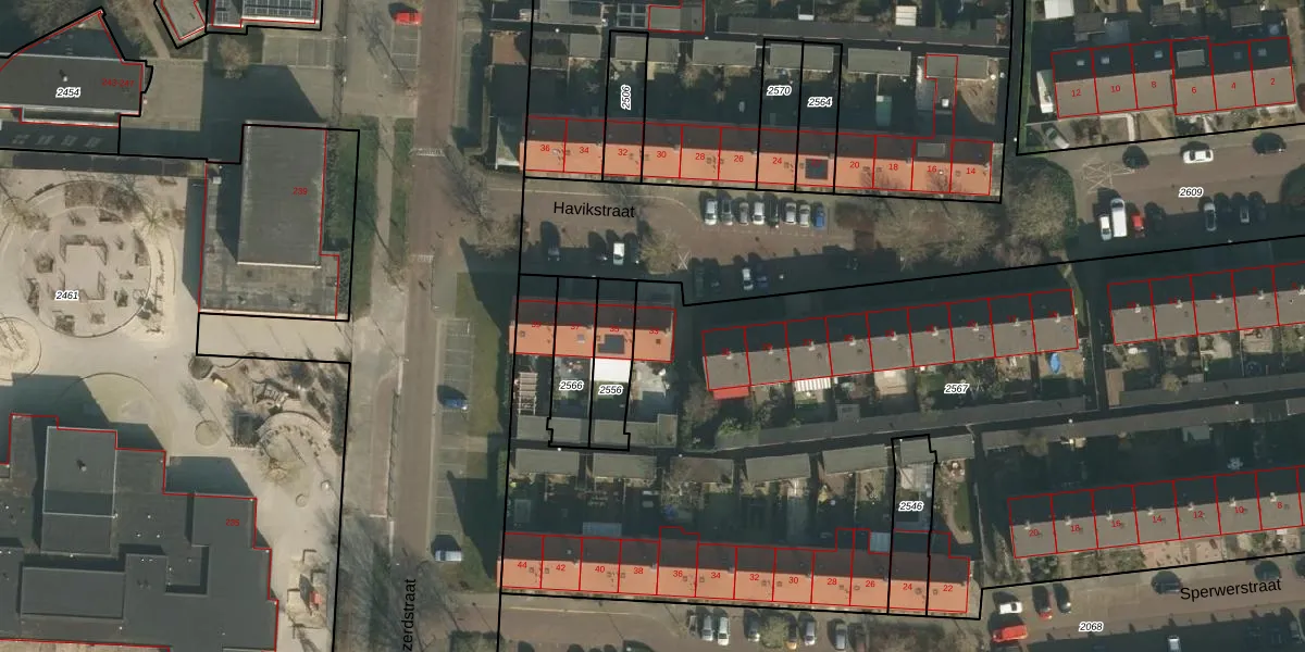 Het perceel waarop Havikstraat 33 staat heeft een oppervlakte van 6147 m². Dit is een zeer groot perceel. De perceeloppervlakte wordt geregistreerd door het Kadaster. Gedetailleerde informatie over de maten van dit perceel kunt u vinden in het rapport Kadastrale kaart met maatvoering van Havikstraat 33.