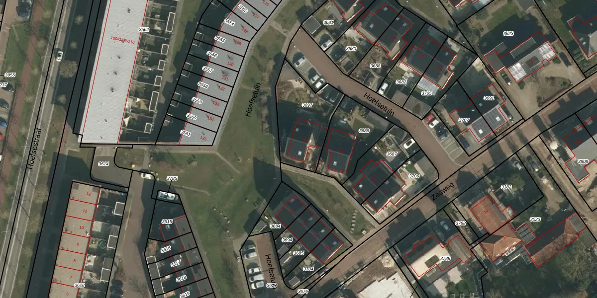 Het perceel waarop Hoefsetuin 24 staat heeft een oppervlakte van 519 m². Dit is een groot perceel. De perceeloppervlakte wordt geregistreerd door het Kadaster. Gedetailleerde informatie over de maten van dit perceel kunt u vinden in het rapport Kadastrale kaart met maatvoering van Hoefsetuin 24.
