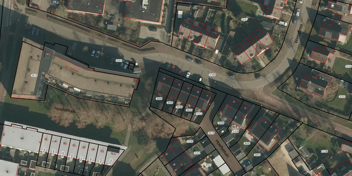 Hoefsetuin 241 is gelegen op kadastraal perceel WCN00B3699. Deze kadastrale aanduiding is uniek en wordt gebruikt door het Kadaster om eigendomsrechten en andere zakelijke rechten vast te leggen. Het perceel maakt onderdeel uit van de kadastrale gemeente Wijchen.