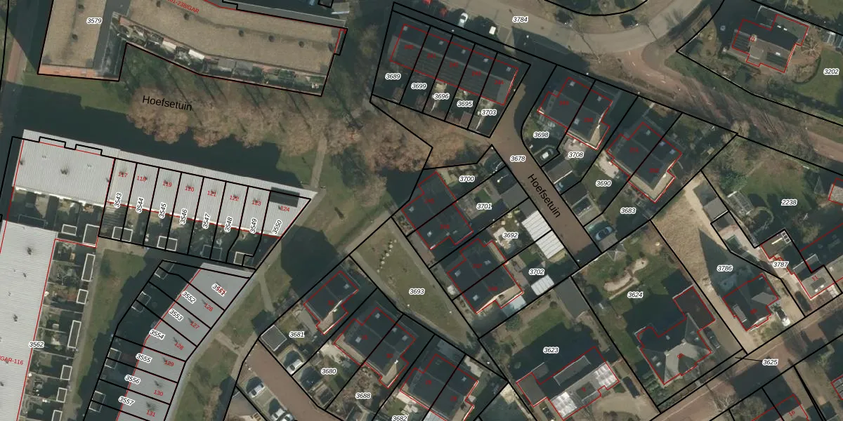 Hoefsetuin 245 is gelegen op kadastraal perceel WCN00B3700. Deze kadastrale aanduiding is uniek en wordt gebruikt door het Kadaster om eigendomsrechten en andere zakelijke rechten vast te leggen. Het perceel maakt onderdeel uit van de kadastrale gemeente Wijchen.