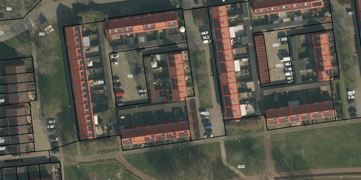 Het perceel waarop Homberg 1908 staat heeft een oppervlakte van 3926 m². Dit is een zeer groot perceel. De perceeloppervlakte wordt geregistreerd door het Kadaster. Gedetailleerde informatie over de maten van dit perceel kunt u vinden in het rapport Kadastrale kaart met maatvoering van Homberg 1908.