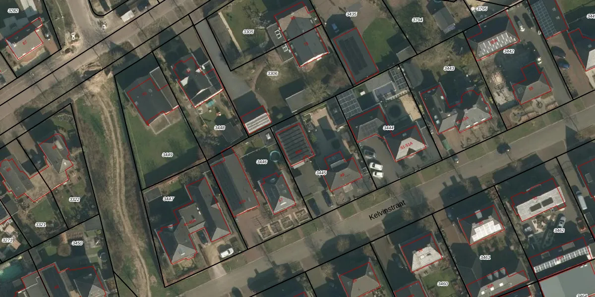 Kelvinstraat 49-A is gelegen op kadastraal perceel WCN00B3445. Deze kadastrale aanduiding is uniek en wordt gebruikt door het Kadaster om eigendomsrechten en andere zakelijke rechten vast te leggen. Het perceel maakt onderdeel uit van de kadastrale gemeente Wijchen.