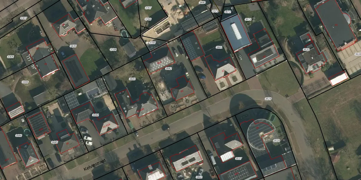 Kelvinstraat 55 is gelegen op kadastraal perceel WCN00B3442. Deze kadastrale aanduiding is uniek en wordt gebruikt door het Kadaster om eigendomsrechten en andere zakelijke rechten vast te leggen. Het perceel maakt onderdeel uit van de kadastrale gemeente Wijchen.