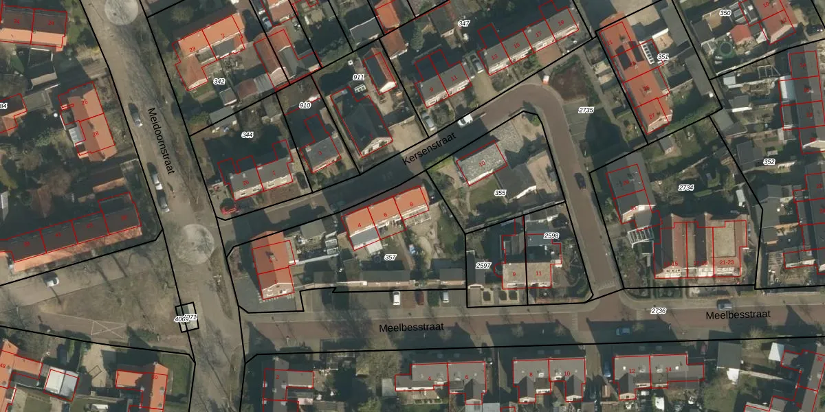 Kersenstraat 8 is gelegen op kadastraal perceel WCN00I357. Deze kadastrale aanduiding is uniek en wordt gebruikt door het Kadaster om eigendomsrechten en andere zakelijke rechten vast te leggen. Het perceel maakt onderdeel uit van de kadastrale gemeente Wijchen.