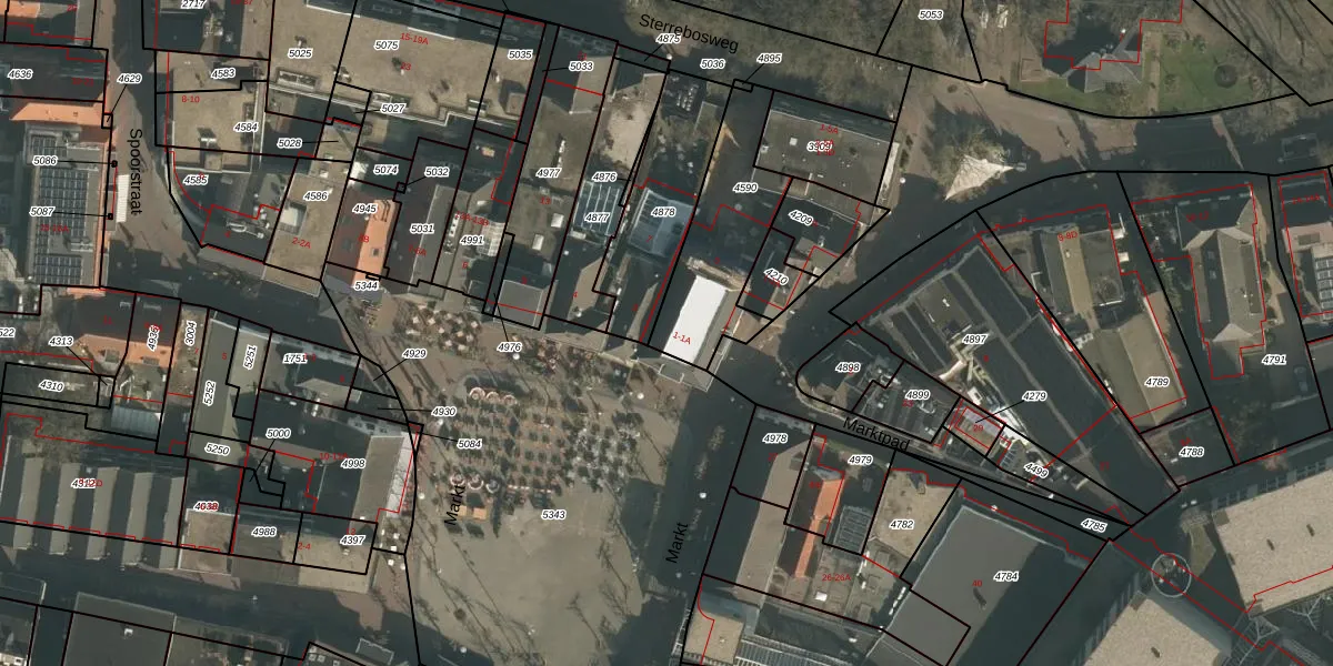 Het perceel waarop Markt 1-A staat heeft een oppervlakte van 450 m². Dit is een groot perceel. De perceeloppervlakte wordt geregistreerd door het Kadaster. Gedetailleerde informatie over de maten van dit perceel kunt u vinden in het rapport Kadastrale kaart met maatvoering van Markt 1-A.