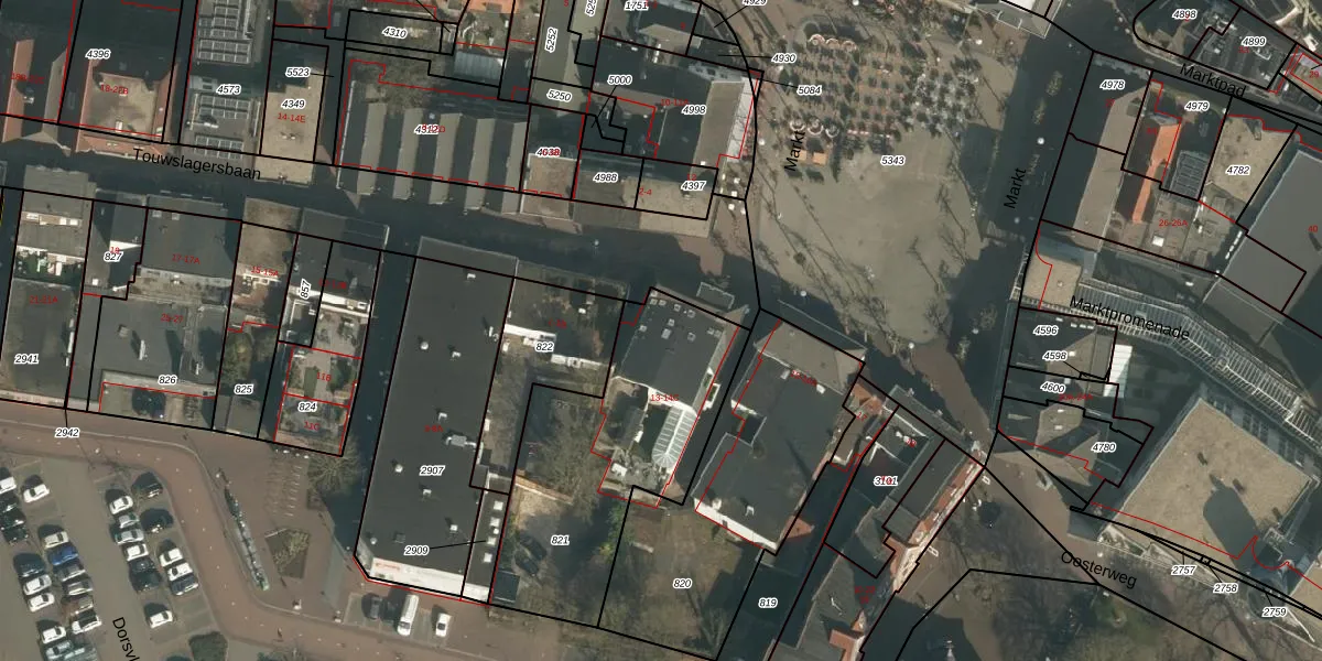 Het perceel waarop Markt 13-A staat heeft een oppervlakte van 1015 m². Dit is een zeer groot perceel. De perceeloppervlakte wordt geregistreerd door het Kadaster. Gedetailleerde informatie over de maten van dit perceel kunt u vinden in het rapport Kadastrale kaart met maatvoering van Markt 13-A.
