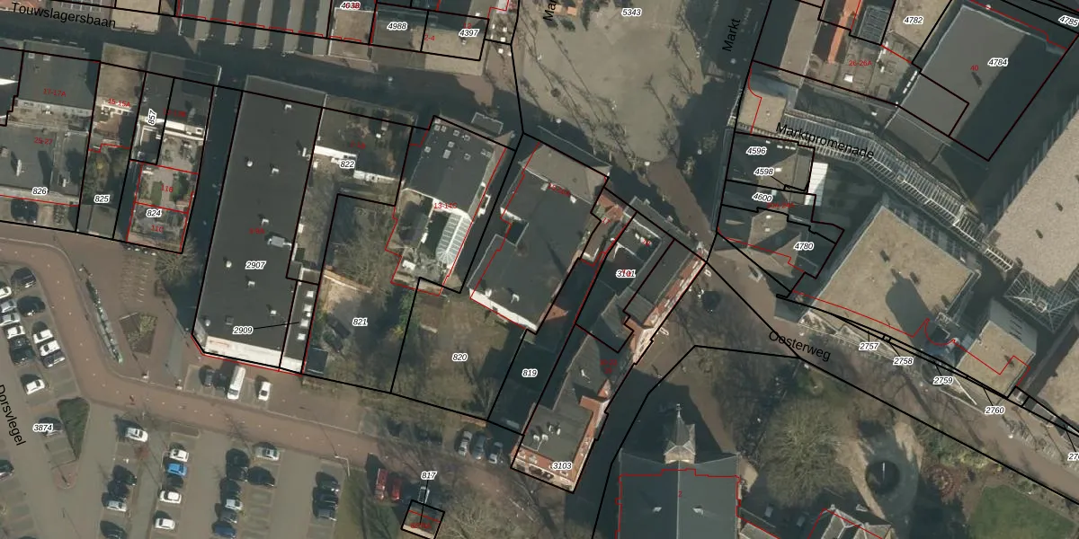 Het perceel waarop Markt 16 staat heeft een oppervlakte van 990 m². Dit is een groot perceel. De perceeloppervlakte wordt geregistreerd door het Kadaster. Gedetailleerde informatie over de maten van dit perceel kunt u vinden in het rapport Kadastrale kaart met maatvoering van Markt 16.