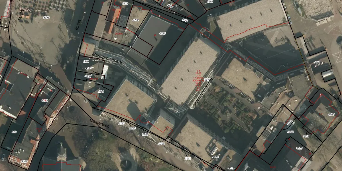 Het perceel waarop Marktpromenade 11 staat heeft een oppervlakte van 8114 m². Dit is een zeer groot perceel. De perceeloppervlakte wordt geregistreerd door het Kadaster. Gedetailleerde informatie over de maten van dit perceel kunt u vinden in het rapport Kadastrale kaart met maatvoering van Marktpromenade 11.